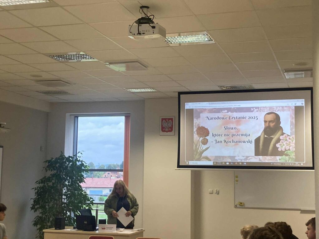 W dniu 11 września 2025 roku uczniowie i nauczyciele zebrali się w auli szkoły, w celu posłuchania wybranej poezji Jana Kochanowskiego. Podczas wydarzenia wysłuchali krótkiego wprowadzenia odnośnie samej akcji Narodowego Czytania oraz najistotniejszych informacji o poecie i jego twórczości oglądając krótką prezentację multimedialną oraz filmik ze słowami Jana Kochanowskiego skierowanymi do uczestników. Uczestniczący w wydarzeniu mieli możliwość posłuchania wybranych losowo najpopularniejszych fraszek Jana Kochanowskiego o różnorodnej tematyce, zarówno humorystycznej jak i ironicznej, czytanych przez przedstawicieli poszczególnych klas i nauczycieli. Była to również okazja zmierzenia się z trudnym, opartym na archaizmach tekstem jednak wszyscy czytający poradzili sobie świetnie. W ramach podziękowania za wspólne spotkanie z literaturą i pielęgnowanie języka ojczystego wszyscy, którzy podjęli się głośnego odczytania fraszek otrzymali pamiątkowe dyplomy.