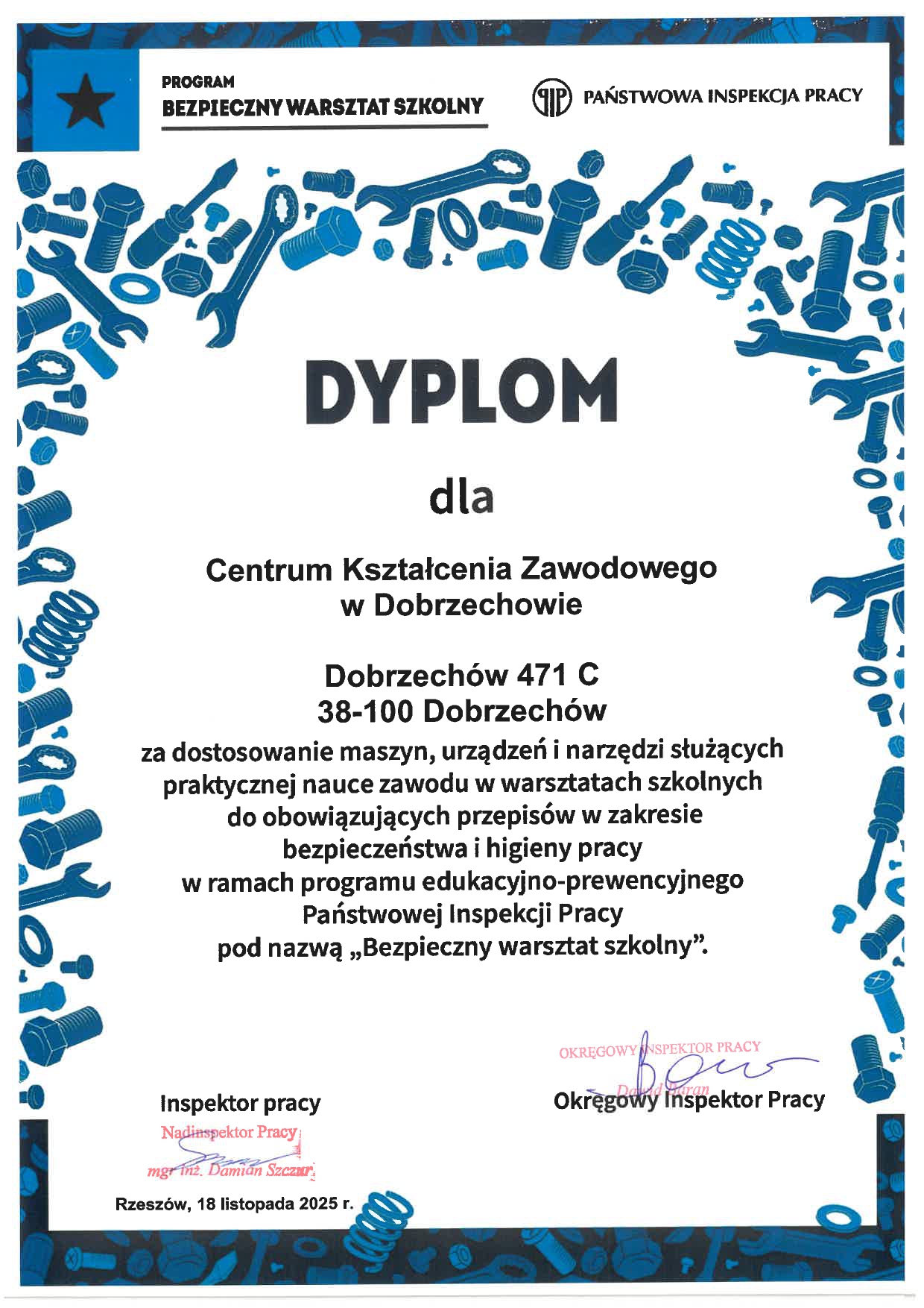 aktualności CKZ “Bezpieczny warsztat szkolny” 19 listopada, 2025 administrator Miło nam poinformować, że nasza placówka wzięła udział w programie edukacyjno-prewencyjnym Państwowej Inspekcji Pracy pod nazwą “Bezpieczny warsztat szkolny”.
