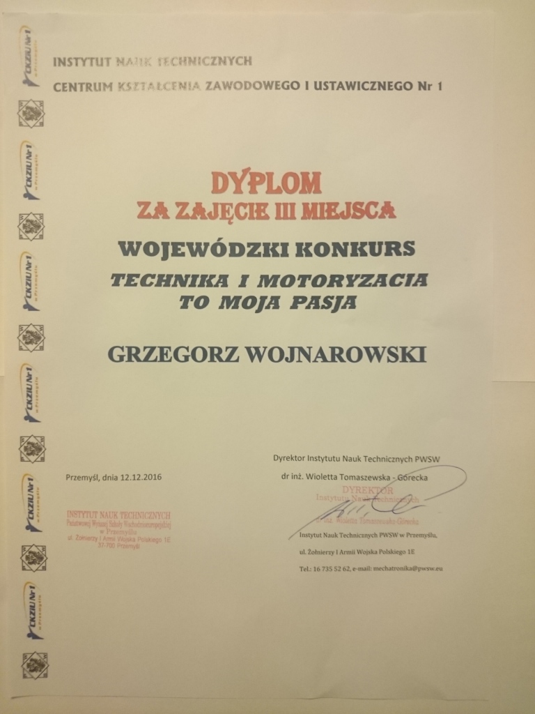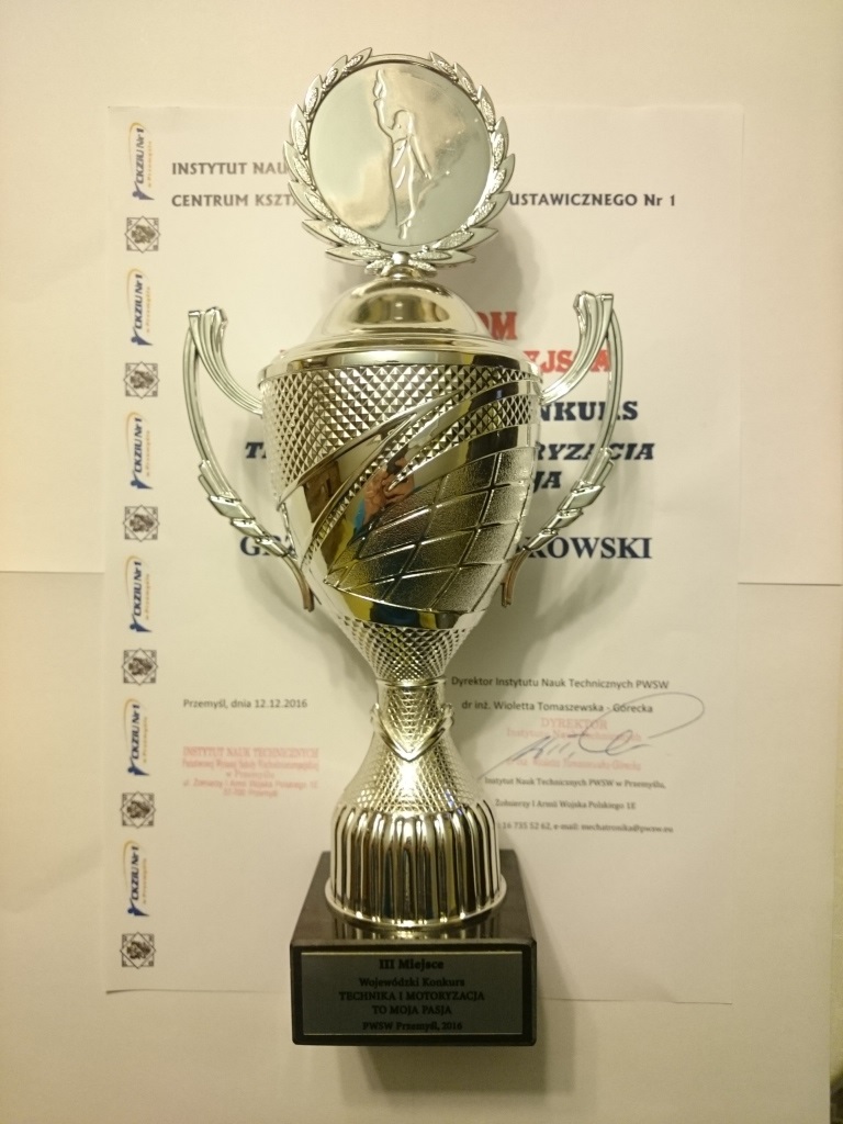 W dniu 12.12.2016 r. uczniowie Centrum Kształcenia Praktycznego w Dobrzechowie z klasy 4TPM, tj. Grzegorz Wojnarowski i Mateusz Dziok, wzięli udział w wojewódzkim konkursie “Technika i motoryzacja to moja pasja”. Konkurs zorganizowany został przez Państwową Wyższą Szkołę Wschodnioeuropejską w Przemyślu. Konkurs składał się z dwóch części: pierwszej – pisemnej, w której zawodnicy musieli zmierzyć się z 20 pytaniami testowymi wielokrotnego wyboru z zakresu wiedzy techniczno-motoryzacyjnej oraz drugiej części – praktycznej obejmującej diagnostykę pojazdów samochodowych. Uczeń Grzegorz Wojnarowski uzyskał awans do finału, w którym udział brało pięciu uczniów z najlepszymi wynikami po części pierwszej, zajmując w finale III miejsce, za które otrzymał puchar oraz pamiątkowy dyplom. W konkursie brali udział uczniowie z województwa podkarpackiego. Opiekunem merytorycznym uczniów był pan Mariusz Domaradzki.