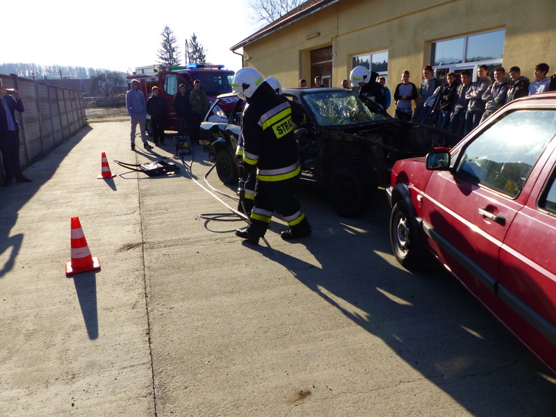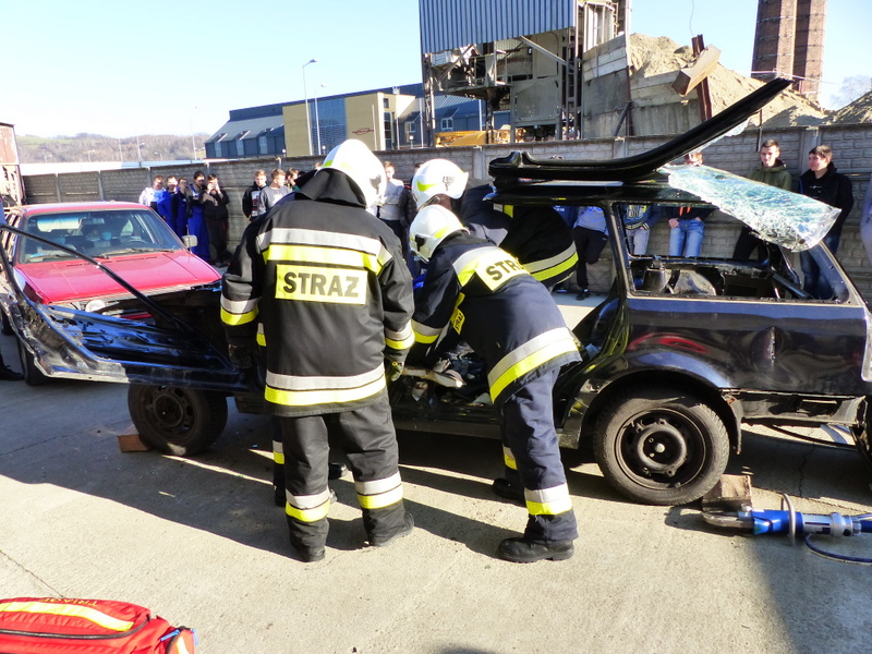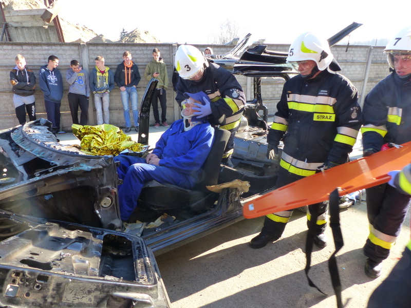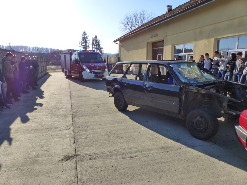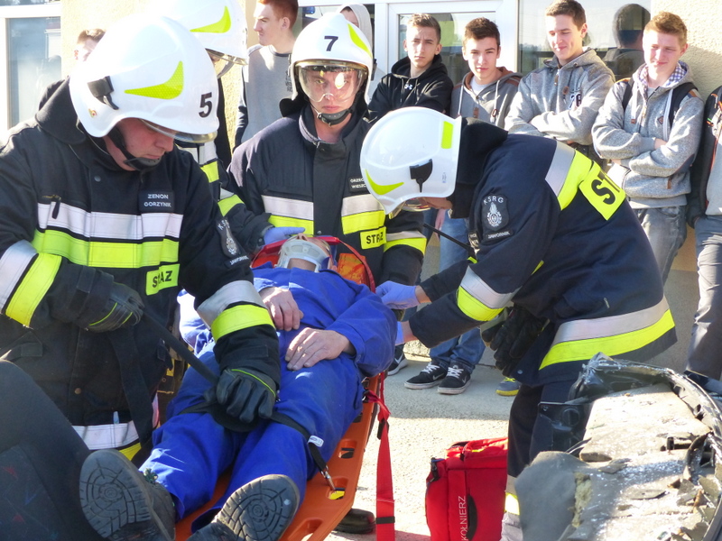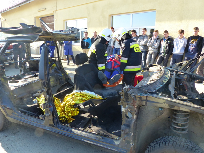 Podczas prezentacji strażacy zaaranżowali zderzenie czołowe dwóch samochodów osobowych. W jednym z nich znajdowała się osoba poszkodowana zakleszczona w pojeździe. Zadaniem strażaków było zabezpieczenie miejsca wypadku, udzielenie pierwszej pomocy przedmedycznej i bezpieczne wydostanie poszkodowanego z pojazdu. Uczniowie mogli na bieżąco zaobserwować wszystkie czynności, jakie wykonują strażacy. Wszystkie powyższe czynności były objaśniane przez radio wozu strażackiego.