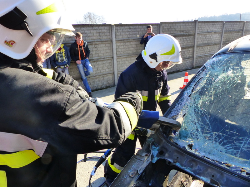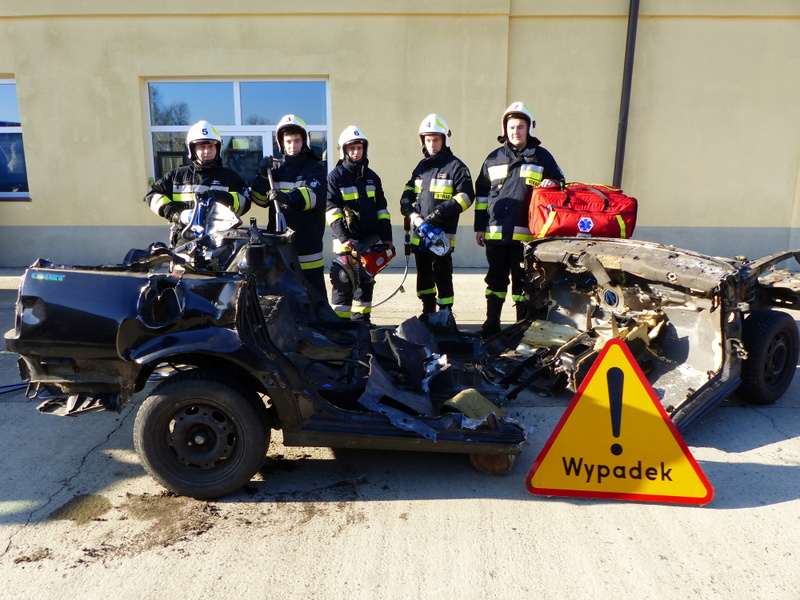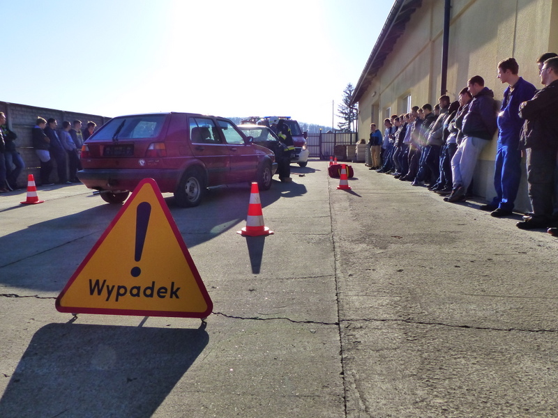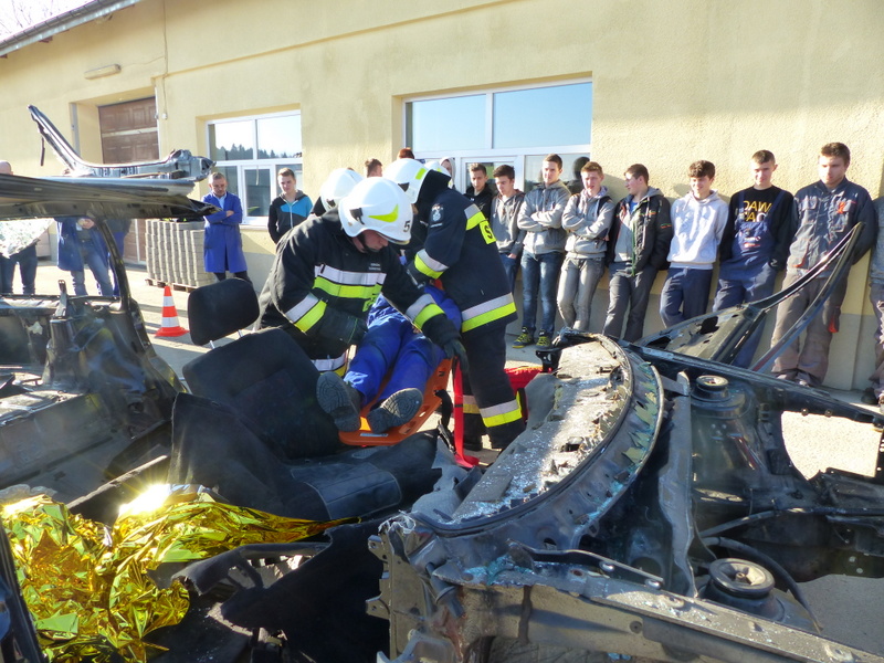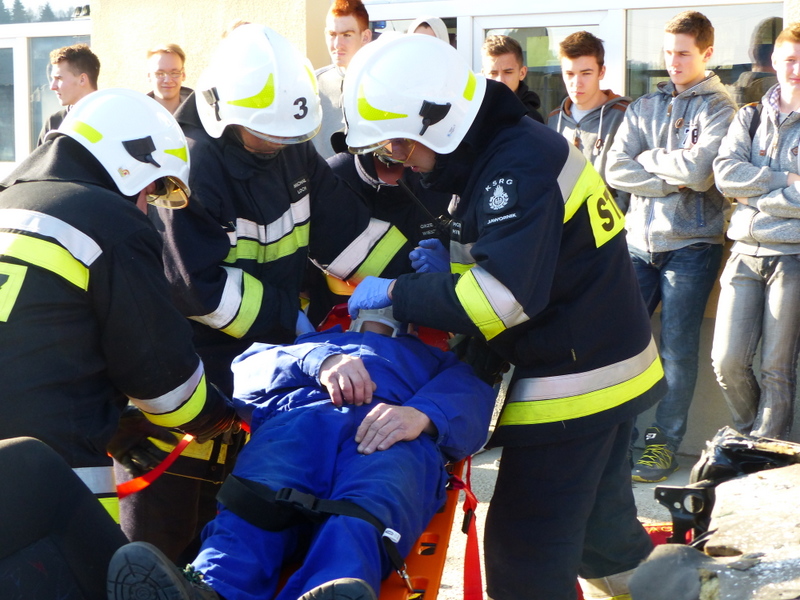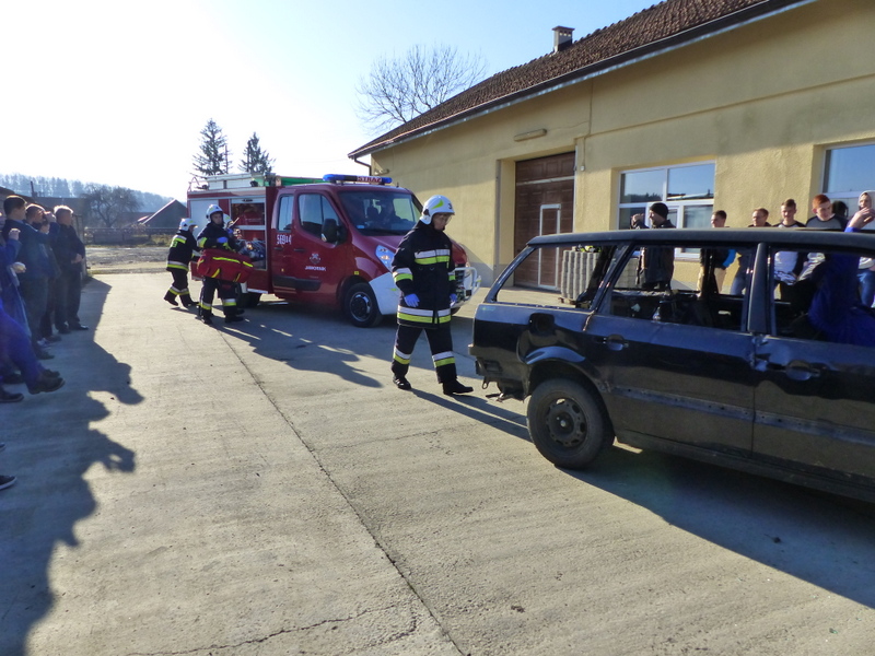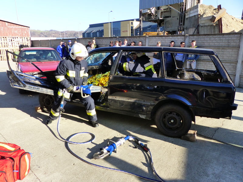 Podczas prezentacji strażacy zaaranżowali zderzenie czołowe dwóch samochodów osobowych. W jednym z nich znajdowała się osoba poszkodowana zakleszczona w pojeździe. Zadaniem strażaków było zabezpieczenie miejsca wypadku, udzielenie pierwszej pomocy przedmedycznej i bezpieczne wydostanie poszkodowanego z pojazdu. Uczniowie mogli na bieżąco zaobserwować wszystkie czynności, jakie wykonują strażacy. Wszystkie powyższe czynności były objaśniane przez radio wozu strażackiego.