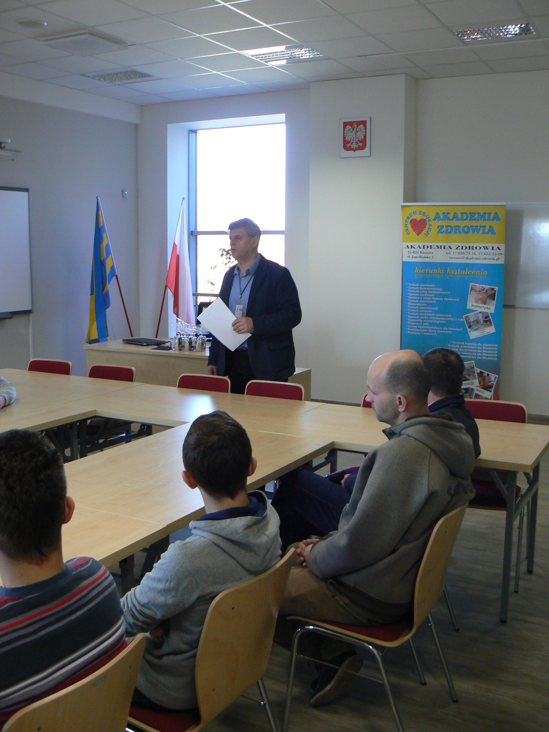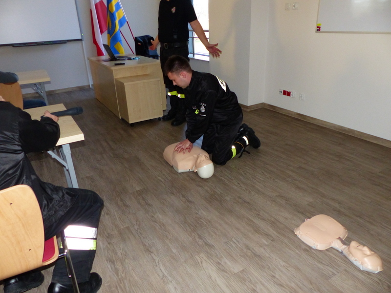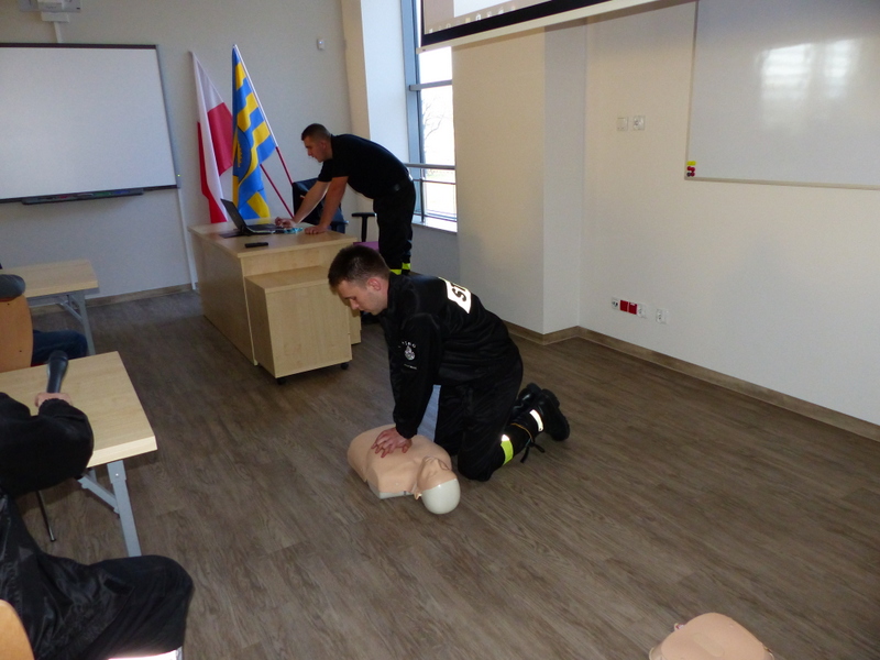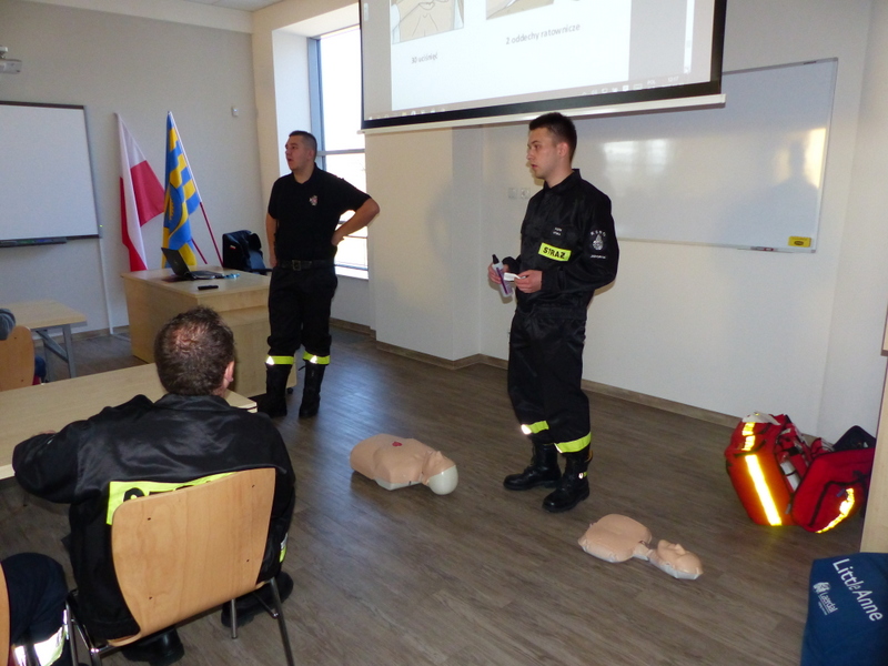 Następnie uczniowie zostali zaproszeni do Auli w Centrum na szkolenie z udzielania pierwszej pomocy przedmedycznej, które zostało przeprowadzone przez strażaków z Jawornika posiadających uprawnienia ratownika medycznego.